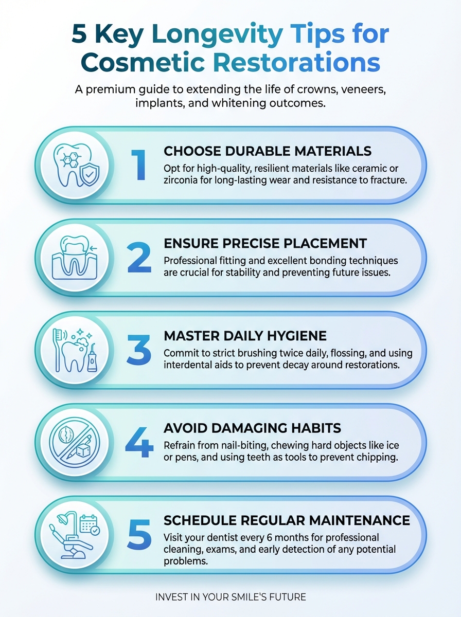 This infographic highlights five essential longevity tips for cosmetic restorations. Learn practical steps for maintenance and material choices to extend durability.